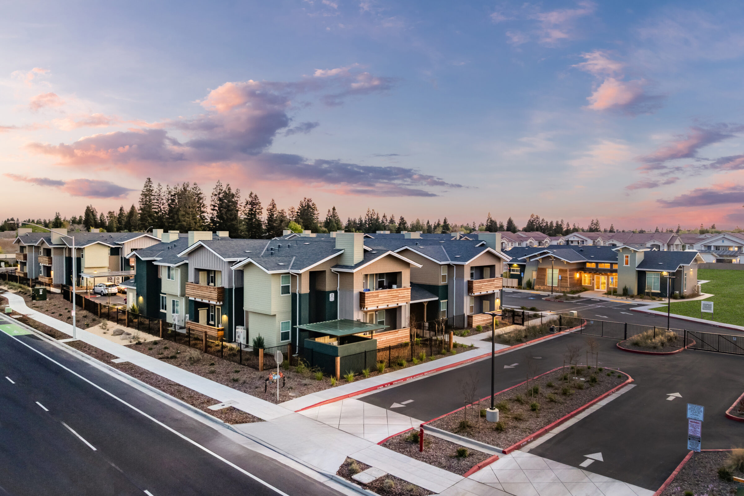 An affordable 60-unit garden-style community in Fresno with solar carports, active outdoor spaces, and a welcoming central hub for residents.