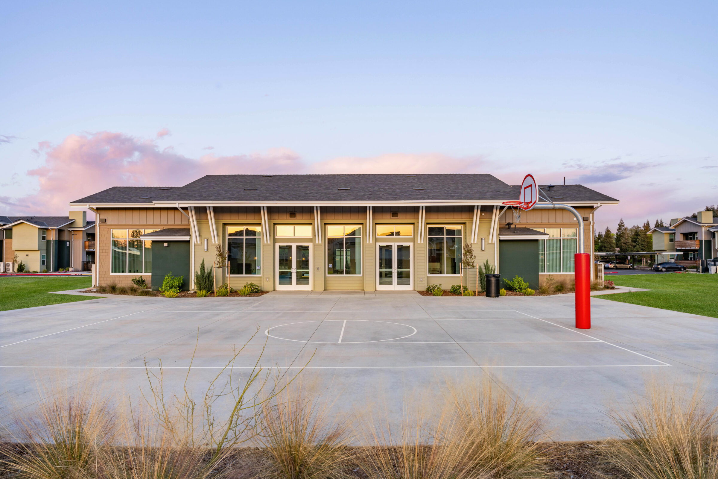 Spanning nearly 5 acres, the site provides many inviting outdoor amenities including a basketball court, dog park, and playground. The parking area also features carports equipped with PV solar panels.